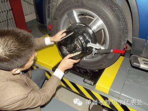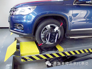 本次测评使用了一辆2010款途观TSI 作为实验用车。首先,亨特培训中心技术人员做演示。将车辆停在转向盘前,用楔子固定车轮,将车辆举起到工作高度。然后安装目标板、设定气压、向前推动车辆完成偏差补偿。简直不可思议,整个过程不到1min,四个车轮的定位数据就显示在显示器上!我们将定位数值进行记录。初次接触HE421四轮定位仪的我们,重复上述过程,虽然不如厂家技术人员熟练,但是也很轻松,很快得到了检测结果,和第一次完全一致。